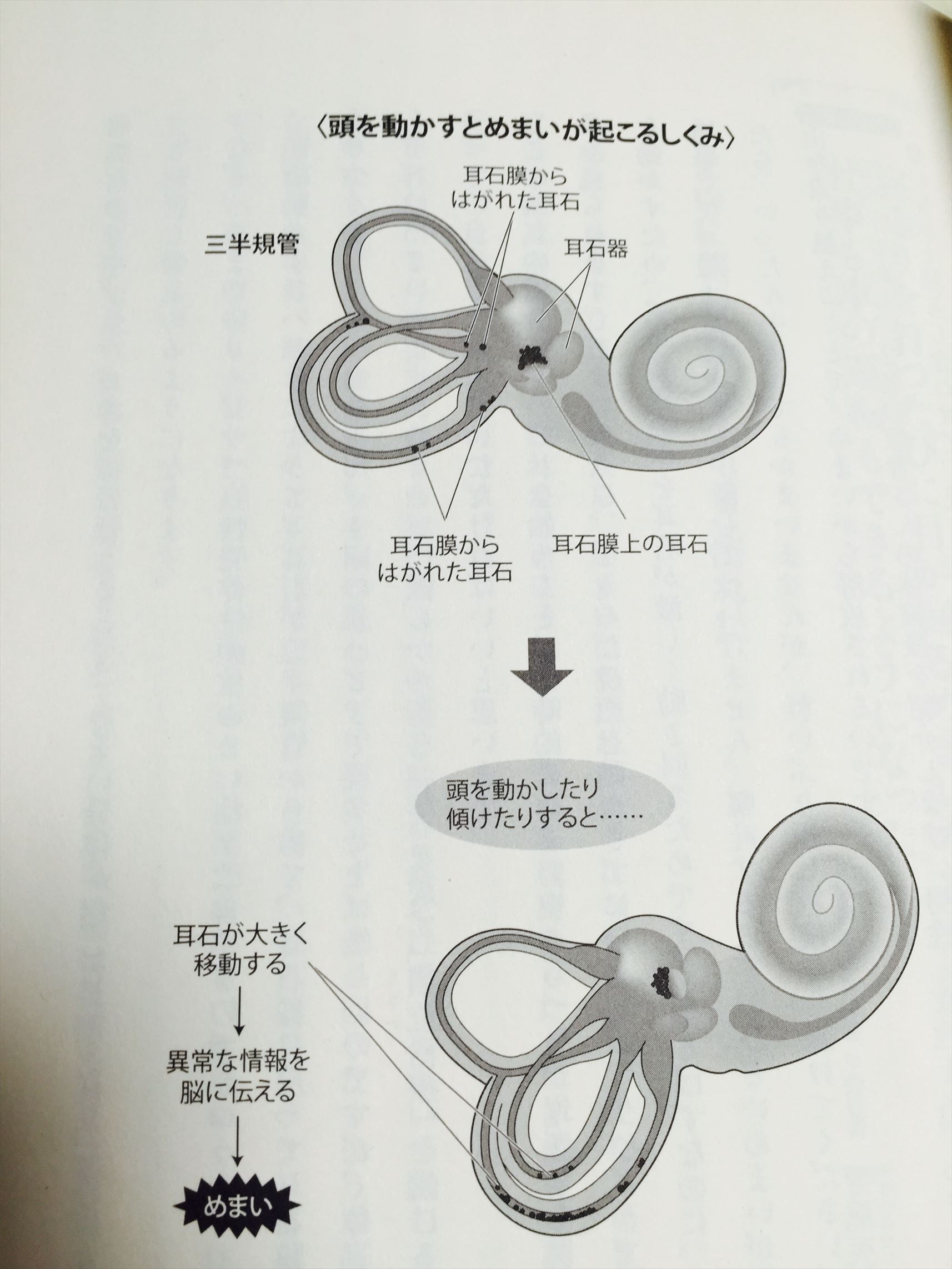 なので、主に、耳石がはがれ、三半規管の中で耳石がプカプカ浮いている時に、【めまい】が起こるので、