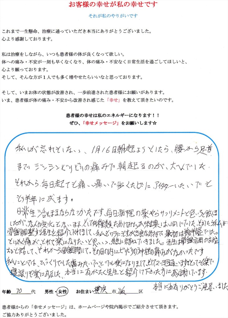 腰から足首まで ジンジン ビリビリ の痛みで朝起きるのが大変でした。